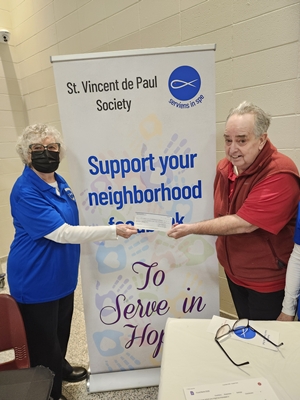 Photo Below: Brother Michael Coakley recently presented a cheque for $1200.00 to Mary Little, President of St. Alfred's Parish St. Vincent de Paul food bank. The funds were raised through the sale of the Knights 2026 Catholic calendars.